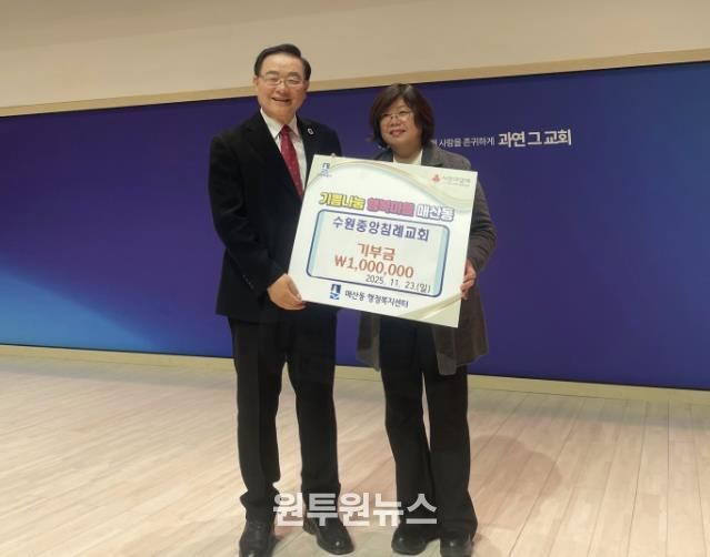 (원투원뉴스) 수원중앙침례교회가 지난 23일, 지역 내 어려운 이웃을 돕기 위해 매산동 지역사회보장협의체 사회복지공동모금회 계좌로 성금 100만 원을 기탁했다.
