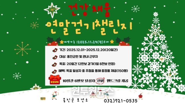 (원투원뉴스) 옹진군은 연말을 맞아 오는 12월 1일부터 20일까지 총 20일간 운영되는 12월 워크온 '건강채움, 연말걷기'챌린지 참가자를 24일부터 모집한다고 밝혔다.