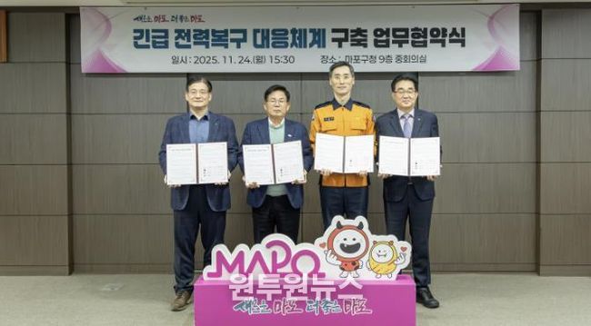 (원투원뉴스) 마포구는 11월 24일 오후 3시 30분, 마포구청 9층 중회의실에서 마포소방서, 한국전력공사 마포용산지사, 한국전기안전공사 서울본부와 함께 ‘전력복구 대응 체계 구축을 위한 업무협약’을 체결했다.