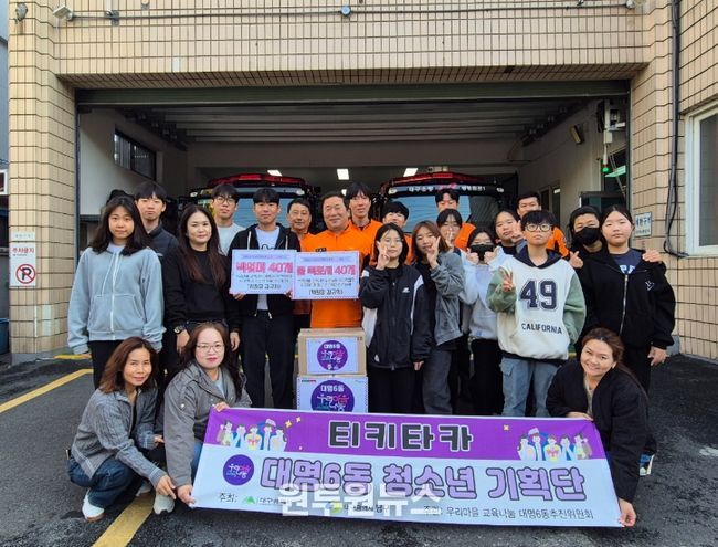 (원투원뉴스) 대구 남구 대명6동은 마을 청소년들이 지난 여름방학 동안 '1일 사장님' 프로그램을 통해 얻은 수익금으로 방한용 넥워머 40개와 여름용 쿨 넥워머 40개를 소방서에 기부하며, 소방의 날을 맞아 소방관들에게 감사와 응원의 마음을 전달했다고 밝혔다.