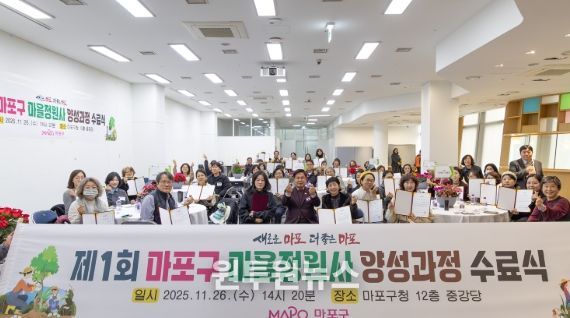 (원투원뉴스) 박강수 마포구청장은 11월 26일 오후 2시 20분, 마포구청 12층 중강당에서 열린 ‘제1회 마포구 마을정원사 수료식’에 참석해 양성과정을 마친 주민들에게 직접 수료증을 수여하고 활동을 격려했다.