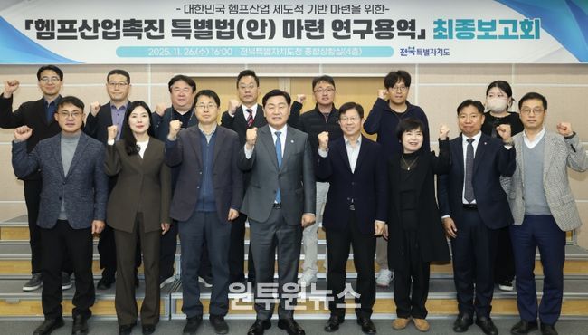 도는 26일 도청 종합상황실에서 '헴프산업촉진 특별법안 보완 및 조문별 조서작성 연구용역' 최종보고회를 개최했다. 이날 보고회에는 도와 새만금개발청, 헴프 관련 기업, 외부 전문가, 용역 수행기관 등 30여 명이 참석해 특별법 제정의 필요성과 추진 전략을 논의했다.