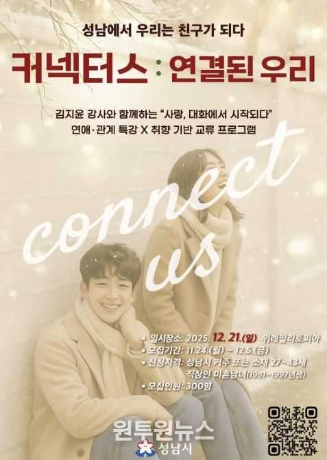 (원투원뉴스) 성남시는 새로운 친구를 만들 수 있는 청년 교류 행사 ‘커넥터스(Connect-us) 연결된 우리’ 참가 희망자 300명을 오는 12월 5일까지 모집한다.