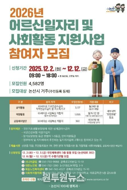 (원투원뉴스) 논산시는 2026년도 어르신일자리 및 사회활동 지원사업 참여자를 오는 12월 2일부터 12일까지 모집한다고 밝혔다.