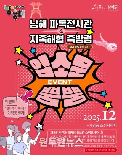 (원투원뉴스) 남해군은 오는 12월 1일부터 파독전시관과 지족해협 죽방렴 전시관에서 ‘입소문 뿜뿜 이벤트’를 실시한다고 밝혔다.