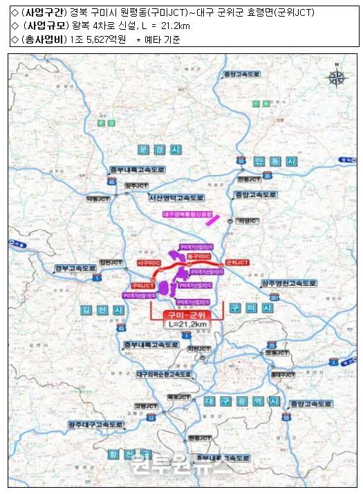 (원투원뉴스) 국토교통부는 11월 27일 열린 재정사업평가위원회(기획재정부 주관)에서 구미-군위 고속도로 건설사업이 사업 타당성을 확보하여 예비타당성조사를 통과했다고 밝혔다.