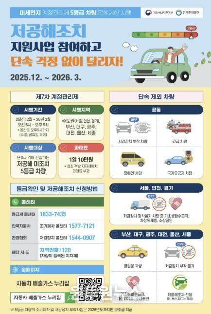 (원투원뉴스) 구리시는 12월부터 내년 3월까지 미세먼지 관리를 강화하고 시민 건강을 보호하기 위해 ‘제7차 미세먼지 계절 관리제’를 시행하며, 이 기간에 노후 경유차 배출가스 5등급 차량의 운행을 제한한다고 밝혔다.
