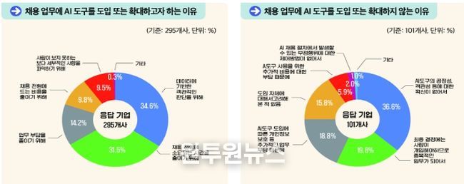 반면에, 도입·확대 계획이 없는 25.5%(101개사) 기업은 ‘AI 도구의 공정성, 객관성 등에 대한 확신이 없어서’(36.6%), ‘최종 결정에는 사람이 개입해야 하므로 중복적인 업무가 되어서’(19.8%)를 주요 이유로 들었는데, 이를 통해 AI 도구의 ‘객관성·공정성·효율성’에 대한 상반된 시각을 확인할 수 있었다.