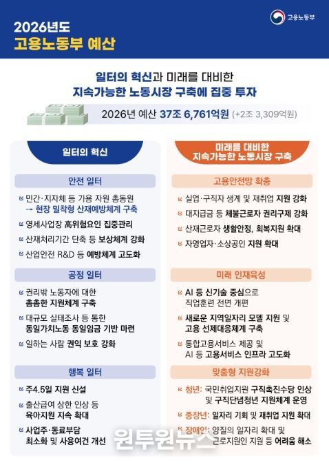 고용노동부는 2026년 예산을 일하는 사람의 생명과 안전을 최우선으로 보호하는 “안전 일터”, 일한 만큼 보상 받고 불합리한 차별이 없는 “공정 일터”, 장시간 근로하지 않고 일·가정 양립이 지켜지는 “행복 일터” 등 국민 삶의 근간이 되는 “일터의 혁신”에 집중 투자할 계획이다. 또한, 취약 노동자에 대한 고용안전망 확충, 인공지능(AI) 등 신기술 중심의 인재 양성, 청년·중장년·장애인의 특성을 고려한 맞춤형 지원 등 미래를 대비한 노동시장 구축에 투자를 확대한다.