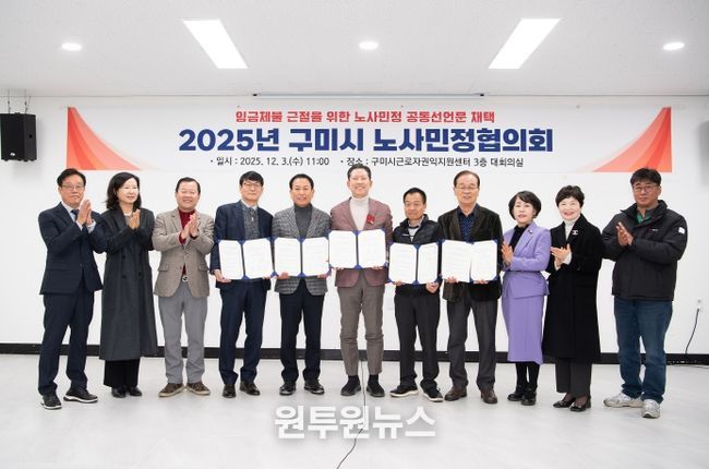 (원투원뉴스) 구미시는 3일 근로자권익지원센터에서 ‘2025년 노사민정협의회 정기회의’를 열고, 임금체불 근절과 상생의 노사문화 확립을 위한 협력 방안을 논의했다. 이날 회의에는 노동계·경영계·시민사회·행정을 대표하는 위원 12명이 참석했다.