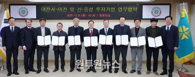 (원투원뉴스) 대전시는 8일 시청 중회의실에서 국내 유망기업 7개 사와 1,328억 원 규모의 투자와 280여 개 일자리 창출을 위한 업무협약(MOU)을 체결하고, 기업의 안정적인 정착과 성장을 위해 전폭적인 행정적・재정적 지원을 약속했다.