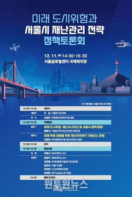 (원투원뉴스) 서울연구원은 기후변화, 초고령화, 기술 고도화 등으로 복합·대형화되는 미래 도시위험에 선제적으로 대응하기 위해 2025년 12월 11일, 오후 2시 서울글로벌센터 국제회의장에서 '미래 도시위험 대응을 위한 서울시 재난관리 전략'을 주제로 정책토론회를 개최한다.