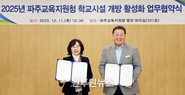 (원투원뉴스) 파주시는 지난 11일 파주교육지원청, 관내 51개 학교와 ‘학교시설 개방 업무협약’을 체결했다고 밝혔다.