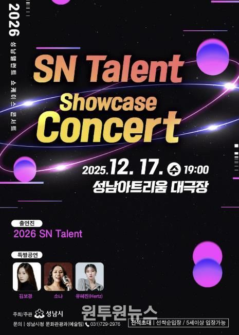 (원투원뉴스) 성남시는 오는 12월 17일 오후 7시 성남아트리움 대극장(수정구 태평동)에서 ‘2026 성남(SN) 탤런트 쇼케이스 콘서트’를 연다.