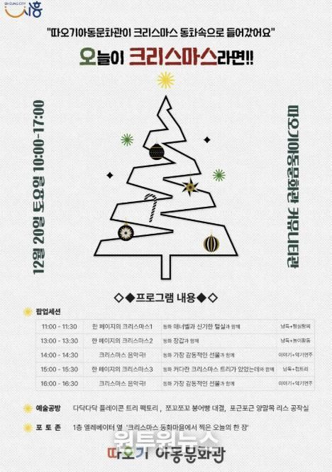 (원투원뉴스) 시흥시 따오기아동문화관이 오는 12월 20일 크리스마스 문화행사 ‘오늘이 크리스마스라면’을 연다. 반짝이는 트리, 서늘한 겨울 공기, 책장을 넘기는 소리가 한데 어우러지며 문화관은 잠시 ‘이야기가 살아 움직이는 공간’으로 변한다.