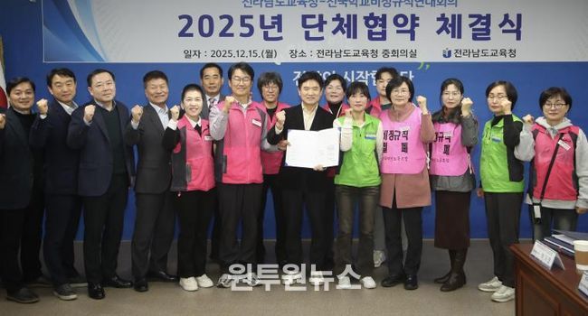 (원투원뉴스) 전라남도교육청과 전국학교비정규직연대회의가 15일 교육 현장의 노사 상생을 통한 교육 공무직원의 권익 신장과 근로 여건 개선을 골자로 한 ‘2025년 단체협약’을 체결했다.