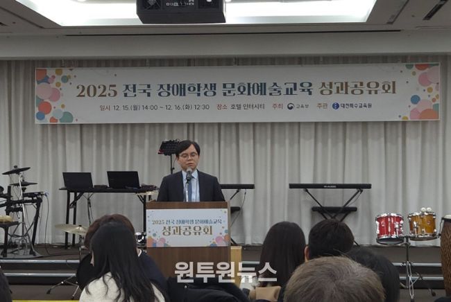 (원투원뉴스) 대전시교육청 특수교육원은 12월 15일부터 16일까지 1박 2일 동안 호텔인터시티에서 전국 시도교육청 문화예술교육 담당 특수교사와 관계자 72명을 대상으로 ‘2025 전국 장애학생 문화예술교육 성과공유회’를 개최했다.