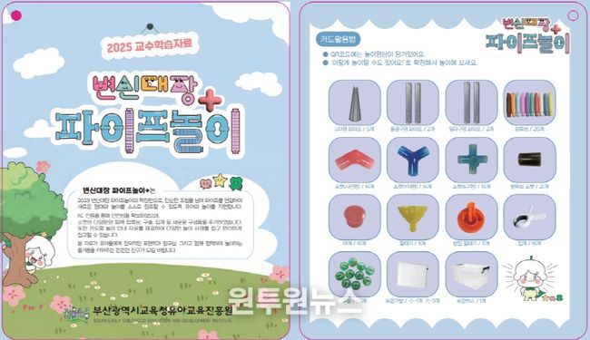 올해는 유치원 현장의 의견을 반영한 ‘2025 변신대장 파이프놀이+’ 자료를 개발해 부산 지역 공·사립 유치원과 유아학급이 설치된 특수학교에 보급했다. 이번 자료는 사선형·Y자형·6구형 소켓 등 연결 요소를 다양화하고, 팝튜브 등 추가 구성품을 확장해 기존 ‘2023 변신대장 파이프놀이’의 활용 범위를 넓힌 확장판이다.