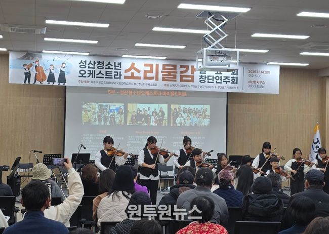 (원투원뉴스) 제주도교육청 제주국제교육원은 14일 오후 5시 성산읍사무소 대회의실에서 제주특별자치도 교육감을 비롯 도의원, 지역인사, 보호자, 주민 등이 참석한 가운데 ‘성산청소년오케스트라 소리물감 창단연주회’를 개최했다.