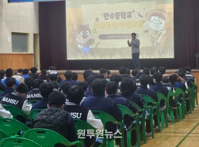 (원투원뉴스) 인천동부교육지원청은 11월 14일부터 12월 16일까지 관내 초·중등 9개 학교 학생 약 1,600명과 교사 60여 명을 대상으로 ‘2025 학교로 찾아가는 맞춤형 학교폭력 예방 교육’을 운영했다.