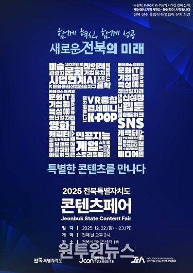 (원투원뉴스) (재)전북특별자치도 콘텐츠융합진흥원과 전북특별자치도 콘텐츠산업협회는 ‘2025 전북특별자치도 콘텐츠페어’를 오는 12월 22일 오후 2시, 전북테크비즈센터에서 공동 주관으로 개최한다고 밝혔다.