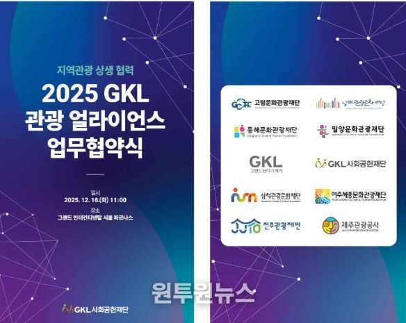(원투원뉴스) 여주세종문화관광재단은 지난 12월 16일 GKL 사회공헌재단이 주관한 ‘GKL 관광 얼라이언스 업무협약식’에 참석하여, 전국 8개 지역관광 전담기관과 함께 문화·관광 분야 공익사업 협력을 위한 업무협약을 체결했다고 밝혔다.