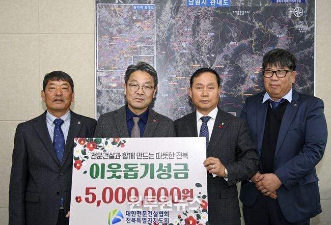 (원투원뉴스) 남원시는 12월 19일 대한전문건설협회 전북도회(회장 임근홍)와 남원지회(회장 김재주)가 '희망2026 나눔 캠페인'에 동참하며 500만 원의 성금을 기탁했다고 밝혔다.