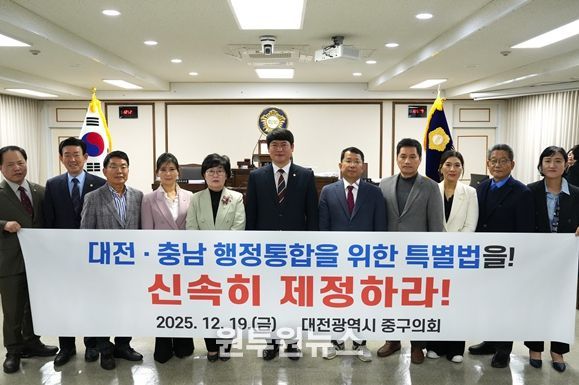 대전 중구의회는 결의문을 통해 ▲이미 제출된 특별법의 조속한 심의·의결 ▲형식적 논의가 아닌 실질적인 행정통합 실행 방안 마련 ▲재정 분권과 자치 권한 확대를 포함한 실질적 특례 제공을 강력히 요구했다.
