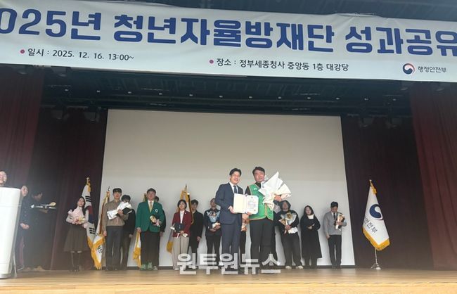 (원투원뉴스) 사천시 자율방재단장 박덕만과 청년자율방재단장 강정일은 지난 12월 16일, 행정안전부가 주최한 '2025년 청년자율방재단 성과공유회 및 장관표창 수여식'에 참석해 청년 재난안전 활동의 성과를 공유하고 우수 사례를 확산하는 뜻깊은 시간을 가졌다.