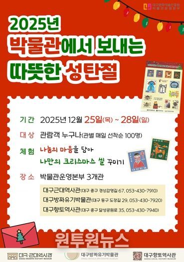 (원투원뉴스) 대구문화예술진흥원 박물관운영본부 소속 대구 시립 3개 박물관(대구근대역사관·대구방짜유기박물관·대구향토역사관)에서는 성탄절을 맞아, 12월 25일부터 28일까지 관람객을 대상으로 ‘2025년 박물관에서 보내는 따뜻한 성탄절 –나만의 크리스마스 씰 꾸미기-’ 문화행사를 진행한다.
