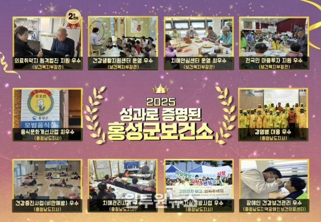홍성군보건소는 2025년 중앙부처와 충청남도가 주관한 11개 분야 평가에서 우수기관에 선정되며 사업 기획력과 실행력을 동시에 인정받았다. 주요 수상내역으로는 ▲의료취약지 원격협진 지원사업 2년 연속 우수기관(보건복지부) ▲건강생활지원센터 운영 우수기관(보건복지부) ▲치매안심센터 운영 최우수기관(보건복지부) ▲치매관리사업 우수사례 공모전 맞춤형 사례관리 부문 우수상(보건복지부) ▲전국민 마음투자 지원사업 우수기관(보건복지부) ▲음식문화개선사업 평가 최우수기관(충청남도) ▲감염병 대응 우수기관(충청남도) ▲건강증진사업(비만예방) 우수기관(충청남도) ▲치매관리사업 우수기관(충청남도) ▲지역자살예방사업 우수기관(충청남도) ▲장애인 건강보건관리 우수기관(충청남도지역장애인보건의료센터)이 포함됐다.