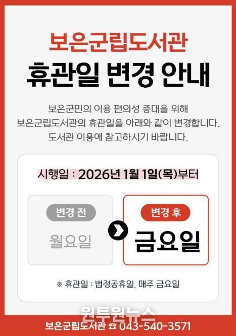 (원투원뉴스) 보은군립도서관은 2026년 1월부터 정기휴관일을 기존 매주 월요일에서 금요일로 변경해 운영한다고 밝혔다.