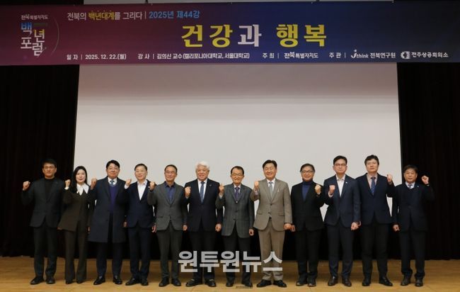 전북연구원은 22일 오전 8시, 전북특별자치도청 4층 대회의실에서 세계적인 암 치료 전문가 김의신 박사를 초청해 ‘건강과 행복’을 주제로 '전북 백년포럼'을 개최했다.