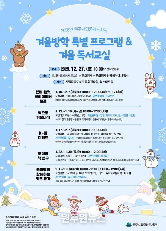 (원투원뉴스) 원주시립중앙도서관은 겨울방학을 맞아 유아부터 청소년을 대상으로 겨울방학 특별 프로그램과 겨울 독서교실을 운영한다.
