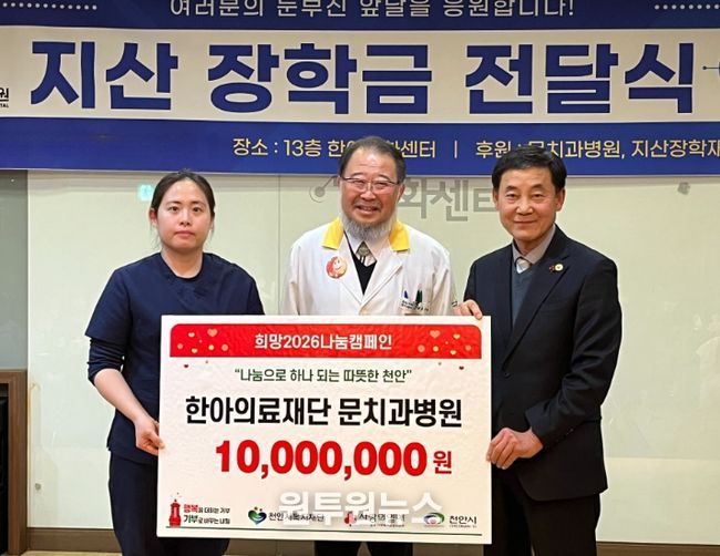 (원투원뉴스) (재)천안시복지재단은 지난 22일 한아의료재단 문치과병원이 학업장려금 3,000만 원을 기탁했다고 밝혔다.