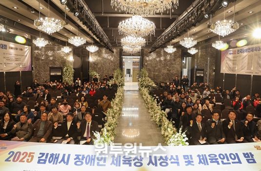 (원투원뉴스) 김해시장애인체육회는 지난 23일 오후 6시 JW웨딩컨벤션에서 2025년 한 해를 마무리하는 ‘김해시장애인체육상 시상식 및 체육인의 밤’ 행사를 개최했다고 24일 밝혔다.