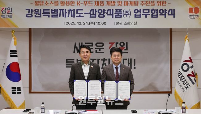 (원투원뉴스) 강원특별자치도는 12월 24일 도청에서 삼양식품(주)과 강원도 특성을 반영한 K-푸드 육성을 위한 업무협약을 체결했다고 밝혔다.