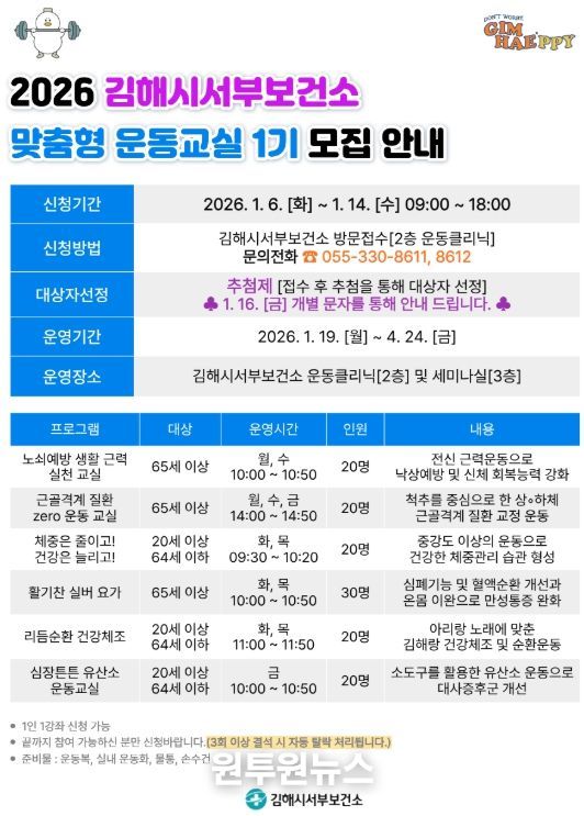 (원투원뉴스) 김해시서부보건소에서 1월 6일부터 14일까지 『2026년 맞춤형 운동교실 1기』 신규 참여자를 모집한다.