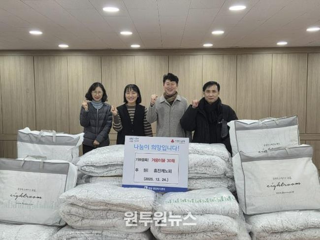 (원투원뉴스) ㈜흥진캐노피는 지난 24일 관내 어려운 이웃이 따뜻한 겨울을 보낼 수 있도록 겨울 이불 30채를 평동행정복지센터에 전달했다.