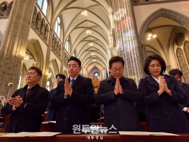 (원투원뉴스) 이재명 대통령과 김혜경 여사가 25일 서울 중구 명동대성당에서 열린 성탄 대축일 미사에서 기도를 하고 있다.