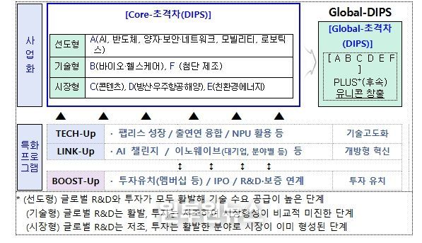 「초격차 프로젝트」는 기본지원(Core-DIPS)과 후속지원(Global DIPS) 등 2단계로 나누어 지원하며, 기술고도화(Tech Up), 개방형 혁신(Link Up),