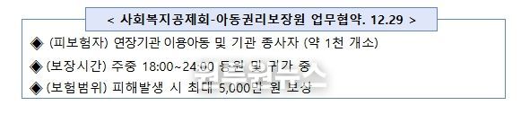 이번 야간 연장돌봄 사업에는 KB금융도 함께 참여한다. 복지부-KB금융 업무협약(’25.10.2.)을 통해 이번 사업 참여기관인 360개소를 포함한 전국 1천여 개 마을돌봄시설의 야간 시간대 이용아동과 종사자들의 안전을 함께 책임진다. 29일에는 사회복지공제회와 아동권리보장원이 업무협약을 맺어 연장기관 이용아동 및 기관 종사자를 대상으로 보험 가입 등을 지원할 예정이다.