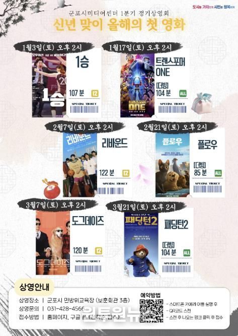 (원투원뉴스) 군포시미디어센터는 2026년 1분기를 맞아 시민들의 문화 향유 기회 확대를 위해 정기 영화 상영회를 운영한다.