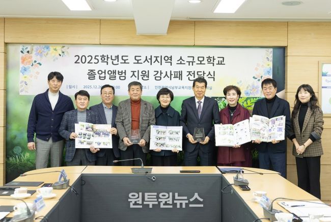 (원투원뉴스) 인천남부교육지원청은 26일 남부 도서학교 졸업앨범 무료 제작에 협력한 인천사진앨범인쇄협동조합, 푸르미재단, 기호일보와 함께 전수식 및 감사패 전달식을 개최했다.