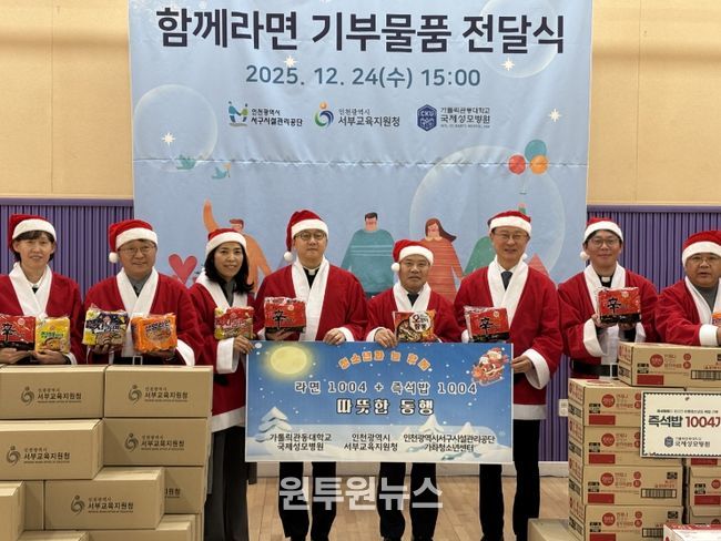 서부교육지원청은 지난 5월 가좌청소년센터에 라면 1,004개를 기부한 데 이어, 12월 24일 크리스마스 이브를 맞아 라면 1,004개를 추가로 전달하며 연말 나눔을 실천했다.