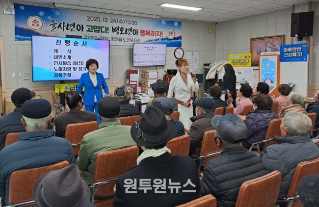 (원투원뉴스) 강진군 강진읍노인회(회장 김승복)가 지난 24일 강진읍 노인복지관 2층 강당에서 150여명의 어르신들이 참석한 가운데 2025년 송년행사를 성대히 마쳤다.