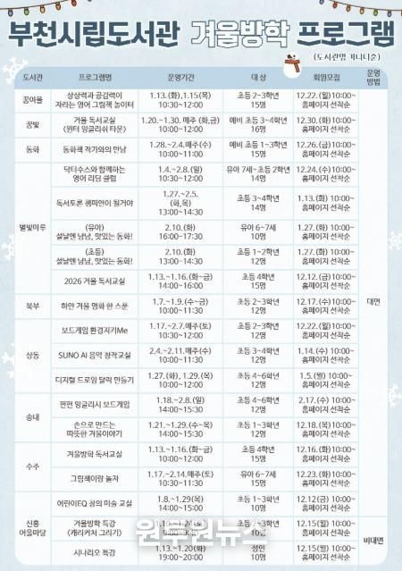 (원투원뉴스) 부천시는 겨울방학을 맞아 내년 1월부터 2월까지 부천시립도서관에서 전 연령을 대상으로 독서문화 프로그램과 행사를 운영한다고 30일 밝혔다. 이번 프로그램은 연령과 관심사에 따라 다양한 참여 기회를 제공하기 위해 마련됐다.