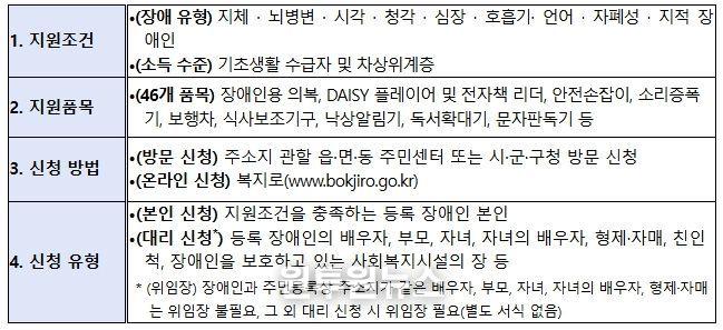 장애인 보조기기 교부 사업은 기초생활 수급자 및 차상위계층에 해당하는 등록 장애인을 대상으로 일상 생활의 편의를 돕기 위한 보조기기를 무료로 지원하는 사업이다.