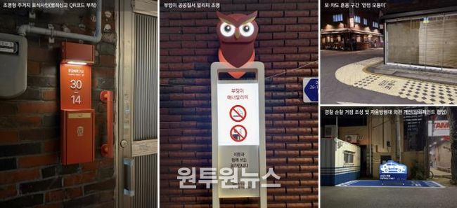 상업 시설로 오인돼 반복적으로 발생하던 주거지 무단침입을 예방하고 주민의 사생활을 보호하기 위해 범죄신고 정보무늬(QR코드)가 부착된 조명형 주거지 표식을 설치했다. 상점 주변에서 발생하는 소음·흡연 문제 개선을 위해서는 ‘부엉이 공공질서 알리미 조명’과 ‘트라이비전 기술 활용 공공질서 표시등’을 도입했다.