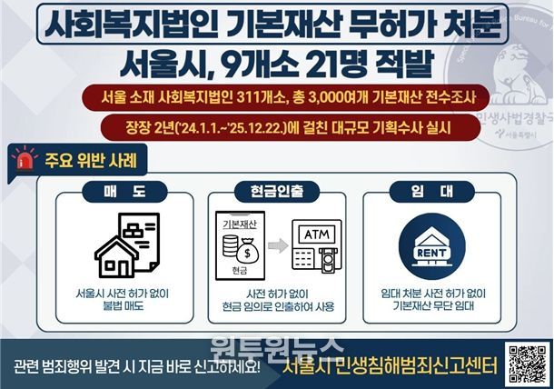 (원투원뉴스) 서울시 특별사법경찰 전담조직인 민생사법경찰국은 사회복지법인의 기본재산을 시·도지사 허가 없이 임의로 매도·임대 등 처분한 사회복지법인 9개소, 21명을 적발하여 수사 중이라고 밝혔다.